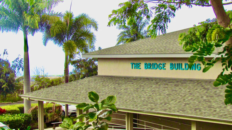 We meet at The Bridge Building at the Makua Lani Christian Academy, located at 74-4966 Kealaka’a Street, Kailua Kona, Hawaii. Drive to the north end of Kealaka’a Street, turn left through Makua Lani Christian Academy’s gate and follow the driveway to the bottom. It will turn to the right and the words “The Bridge Building” are in large block letters on the building.